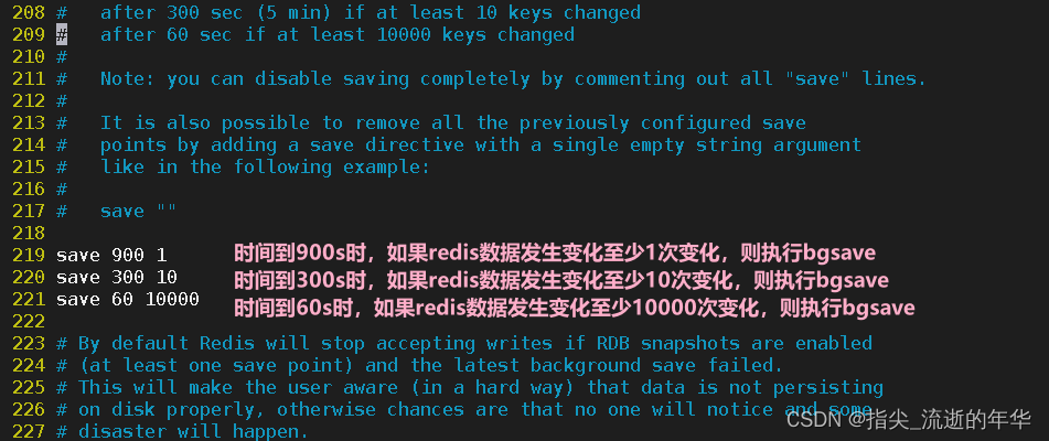 vim /etc/redis/6379.conf #编辑配置文件----219行--以下三个save条件满足任意一一个时,都会引起bgsave的调用save 900 1 #当时间到900秒时,如果redis数据发生了至少1次变化,则执行bgsavesave 300 10 #当时间到300秒时,如果redis数据发生了至少10次变化,则执行bgsavesave 60 10000 #当时间到60秒时,如果redis数据发生了至少10000次变化, 则执行bgsave----242行--是否开启RDB文件压缩rdbcompression yes----254行--指定RDB文件名dbfilename dump.rdb----264行--指定RDB文件和AOF文件所在目录dir /var/lib/redis/6379