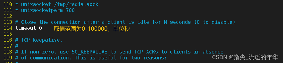 vim /etc/redis/6379.conf-----114行------114 timeout 0 #单位为秒(s),取值范围为0~100000。默认值为0,表示无限制,即Redis不会主动断开连接,即使这个客户端已经空闲了很长时间。#例如可设置为600,则客户端空闲10分钟后,Redis会主动断开连接。#注意:在实际运行中,为了提高性能,Redis不一定会精确地按照timeout的值规定的时间来断开符合条件的空闲连接,例如设置timeout为10s,但空闲连接可能在12s后,服务器中新增很多连接时才会被断开。