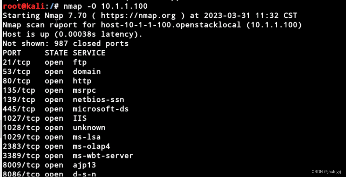 如下图所示,可以看到目标主机开放了哪些端口,以及对应的服务。我们还可以加上-sV参数来探测详细的服务版本号: