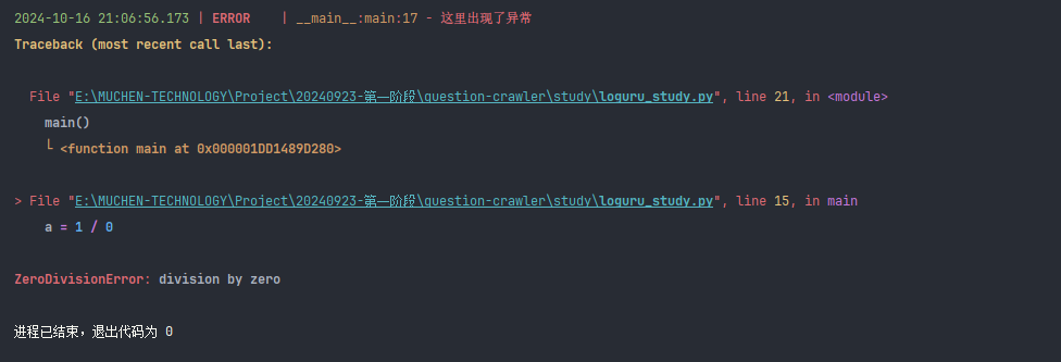 def main():try:a = 1 / 0except:# 使用logger.exception()方法,可以打印出异常的堆栈信息logger.exception("这里出现了异常")