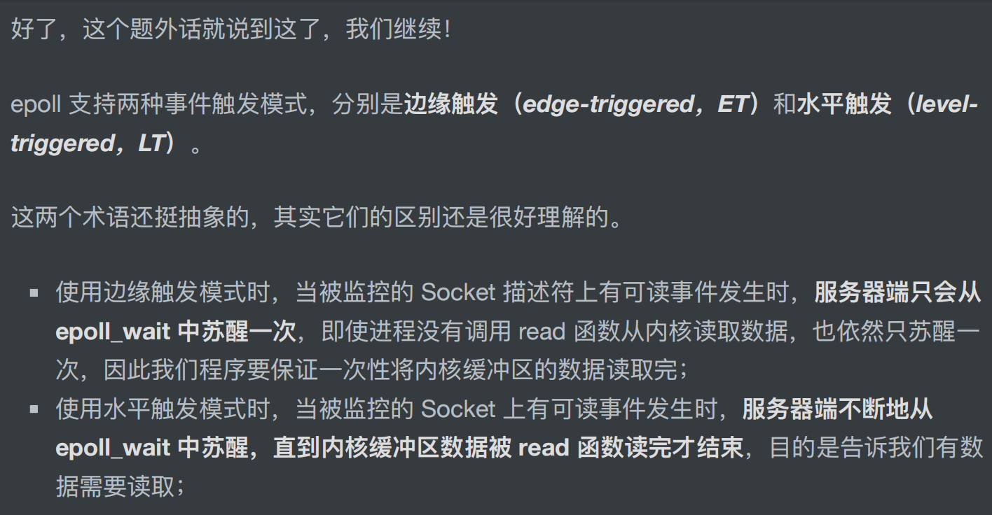 通过上述一系列代码,当监听套接字上有可以读的事件(如三次握手的连入),该监听套接字就能够得到内核的通知