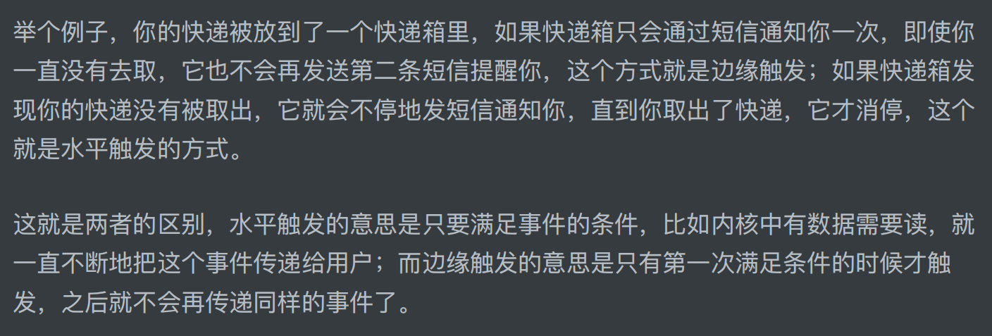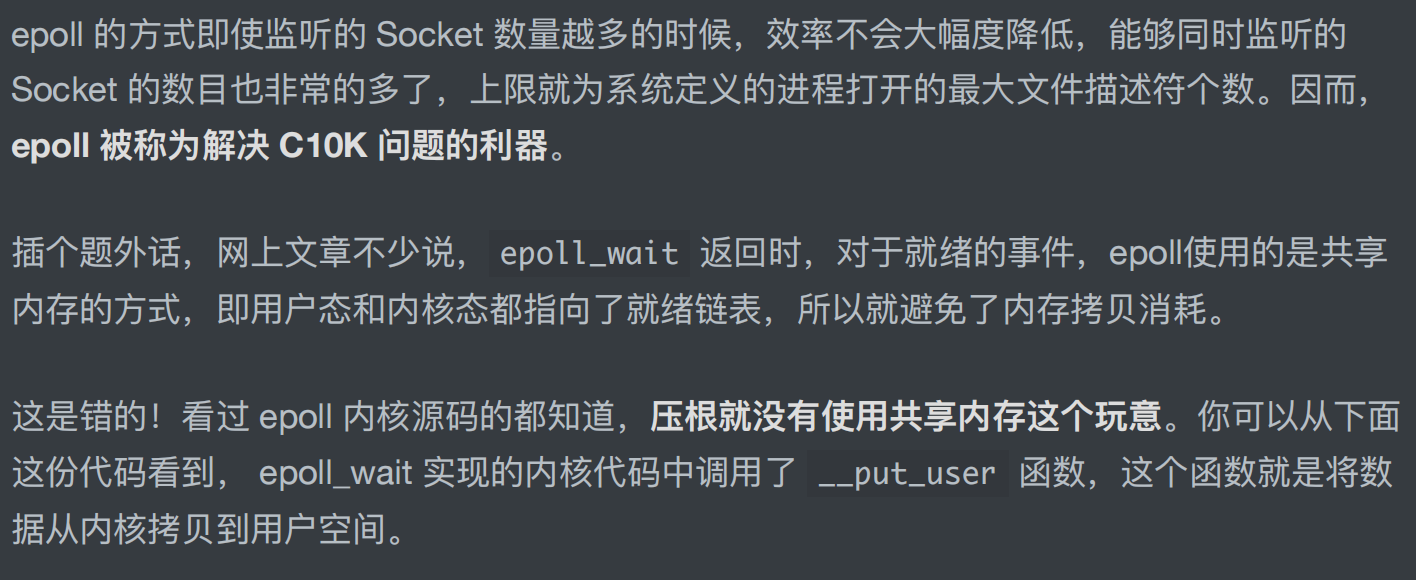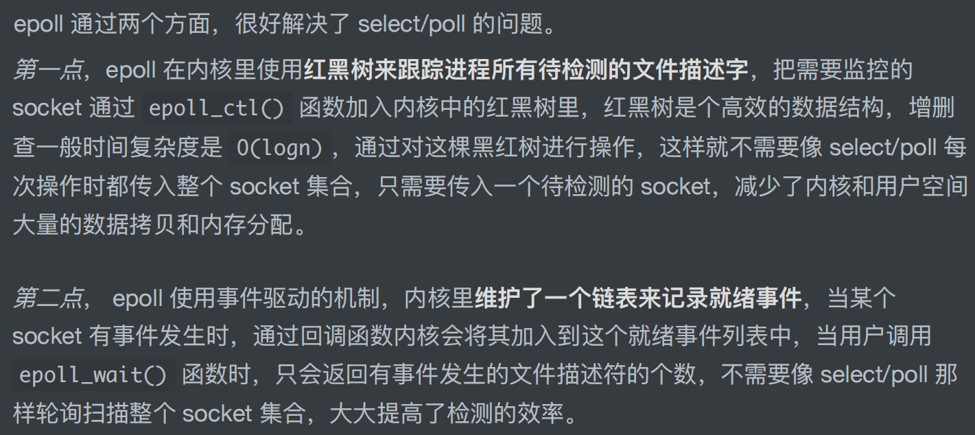 - ①epoll技术原理就是:创建红黑树,把套接字感兴趣的事件作为红黑树的节点加到红黑树中,接收到事件时,有事件的套接字会被内核放进双向队列中。