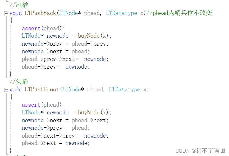 相关的头插和尾插都要先处理新插入进来的结点,再处理前后两节点。这样不会存在找不到前后节点的情况,同时能减少代码量。