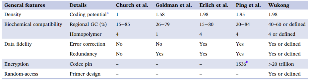 a Church等人、Goldman等人、Erlich和Zielinski,以及Ping等人提出的算法的详细特征在表中保持了它们原版的特征。使用Ping等人描述的公式计算了“悟空”算法的编码潜力。其余的编码潜力引用自Ping等人。