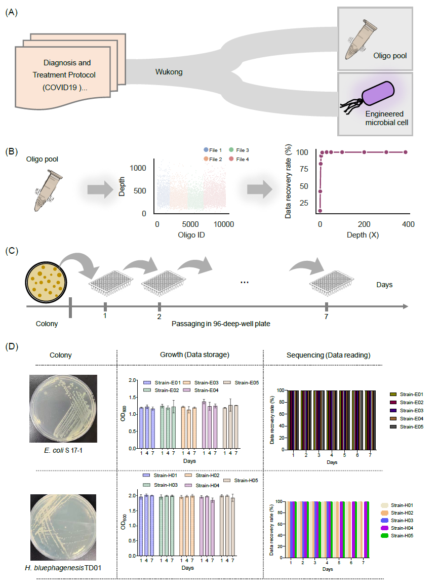 (A) “悟空”算法在体外和体内存储数据的示意图。我们通过寡核苷酸池合成了从《新型冠状病毒肺炎诊疗方案》第七、第八和第九版以及古代中医著作《伤寒杂病论》中编码的序列,用于体外存储。此外,我们还将一些用于治疗COVID-19的传统中药方剂编码并合成到细胞中的基因中;(B) 通过测序读取寡核苷酸池。所有寡核苷酸的测序深度显示在中间,数据恢复率显示在右侧。(C) 体内数据传递的示意图。(D) 数据存储在大肠杆菌S17-1和噬盐单胞菌TD01菌株中,并稳定复制了7天。通过测序获得的生长状态和数据恢复率如图所示。
