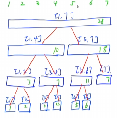 区间查询[l,r]是指在线段树内从上向下查询,如果子区间的左右端点都在[l,r]内则不用在向下递归,直到找到所有的点