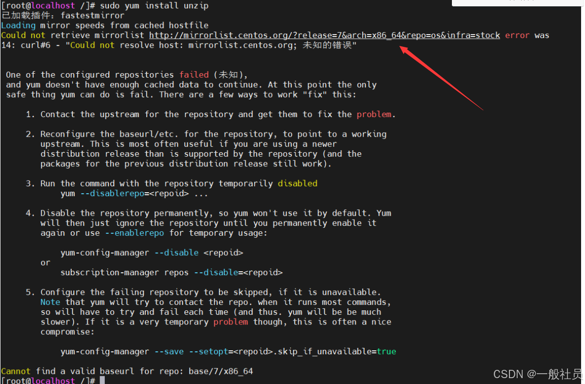 如果能正常安装unzip,无报错,忽视如下问题,如果安装出现如下界面,请先解决