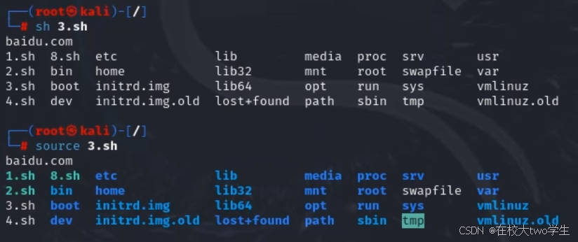 直接把ls命令放到2.sh里面去 sh 2.sh 可以看见直接输出了当前目录下的 2.sh颜色加深了