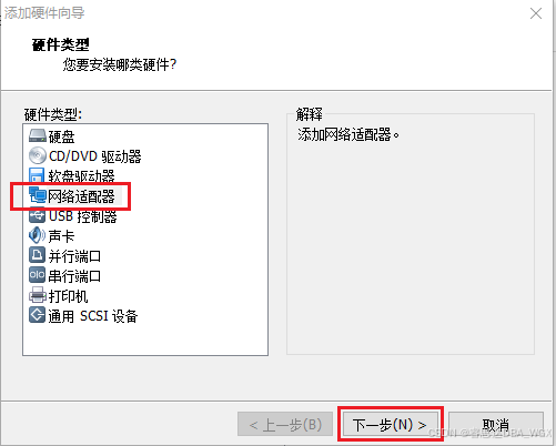 2、弹出如下图所示的【添加硬件向导】窗口,在窗口中的【硬件类型】列表中选择【网络适配器】,单击【下一步】按钮。