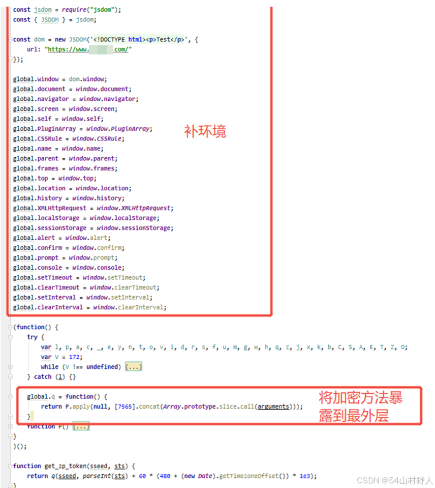 调试发现加密用到的方法都在这个文件中,整个文件复制下来,把缺的环境都补上,最后的js代码结构如下: