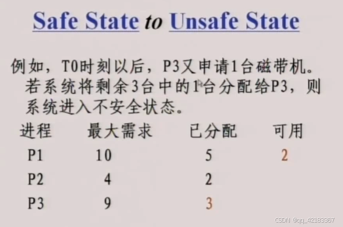 死锁的概念 死锁产生的条件 前三种条件可能会产生死锁,第四种条件(环路)可能会产生死锁 机器检测是否死锁是——检测是否有环路 解决死锁 以上预防死锁的方法不太实用,低效 银行家算法 P2运行完后可用队列就变成了 6 2 3…...