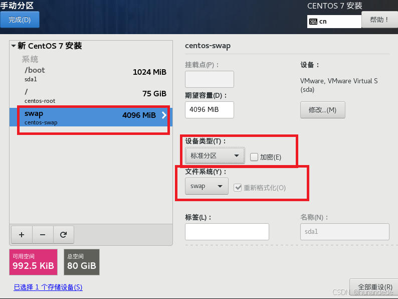 swap 分区 的设备类型 和 文件系统 选择成如下的样子