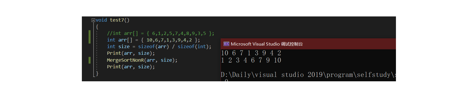 {int* tmp = (int*)malloc(sizeof(int) * n);assert(tmp);int gap = 1;while (gap < n){for (int i = 0; i < n; i += 2 * gap)//2*gap:一个gap代表一组间距,归并一次需要两组,故下次从第三组开始{//step1:分区间:[i,i+gap-1]、[i+gap,i+gap*2-1]int begin1 = i, end1 = i + gap - 1;int begin2 = i + gap, end2 = i + gap * 2 - 1;int cur = begin1;//此处不能直接使cur赋值为0//step2:修正区间if (end1 >= n){end1 = n - 1;begin2 = n;end2 = n - 1;}else if (begin2 >= n){begin2 = n;end2 = n - 1;}else if (end2 >= n){end2 = n - 1;}//step3:归并,两区间元素比较排序while (begin1 <= end1 && begin2 <= end2)//两区间均有值{if (a[begin1] < a[begin2])//以升序为例tmp[cur++] = a[begin1++];elsetmp[cur++] = a[begin2++];}while (begin1 <= end1)//处理剩余区间tmp[cur++] = a[begin1++];while (begin2 <= end2)tmp[cur++] = a[begin2++];}memcpy(a, tmp, sizeof(int) * n);//同gap组一次性归并gap *= 2;}printf("\n");free(tmp);