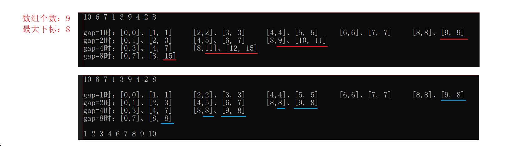 {int* tmp = (int*)malloc(sizeof(int) * n);assert(tmp);int gap = 1;while (gap < n){printf("\ngap=%d时:", gap);for (int i = 0; i < n; i += 2 * gap)//2*gap:一个gap代表一组间距,归并一次需要两组,故下次从第三组开始{//step1:分区间:[i,i+gap-1]、[i+gap,i+gap*2-1]int begin1 = i, end1 = i + gap - 1;int begin2 = i + gap, end2 = i + gap * 2 - 1;int cur = begin1;//此处不能直接使cur赋值为0//step2:修正区间if (end1 >= n || begin2 >= n){break;}else if (end2 >= n)//需要修正边界{end2 = n - 1;}printf("[%d,%d]、[%d, %d] ", begin1, end1, begin2, end2);int space = end2 - begin1 + 1;//step3:归并,两区间元素比较排序while (begin1 <= end1 && begin2 <= end2)//两区间均有值{if (a[begin1] < a[begin2])//以升序为例tmp[cur++] = a[begin1++];elsetmp[cur++] = a[begin2++];}while (begin1 <= end1)//处理剩余区间tmp[cur++] = a[begin1++];while (begin2 <= end2)tmp[cur++] = a[begin2++];memcpy(a+i, tmp+i, sizeof(int) * space);//单组归并}gap *= 2;}printf("\n");free(tmp);