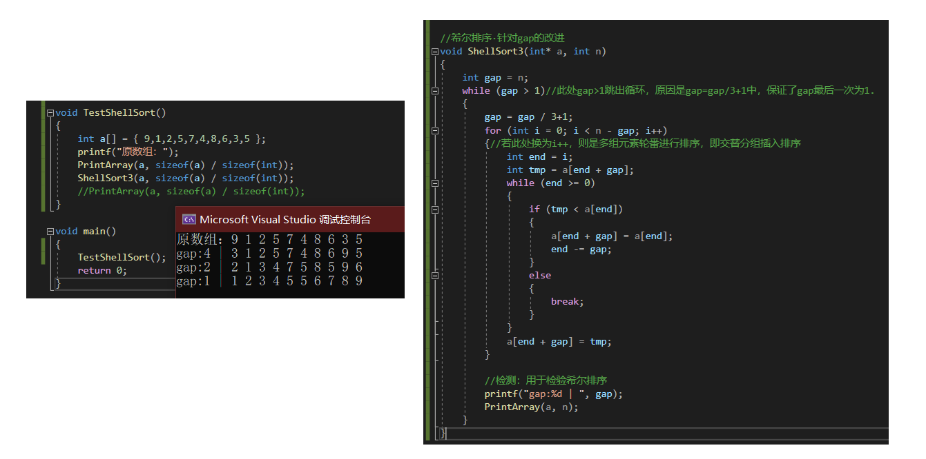 int end;//默认[0,end]有序,待插入数在下标为end+1的位置int tmp = a[end + 1];//tmp用于保存当前趟中待插入数(原因:后续该位置会被覆盖)while (end >= 0){if (tmp < a[end]){a[end + 1] = a[end];//排升序:tmp需要放到end、end+1之间,即a[end]≤tmp≤a[end+1]end--;}elsebreak;//若不满足if条件,说明当前位置找到了,直接跳出}a[end + 1] = tmp;//再插入值