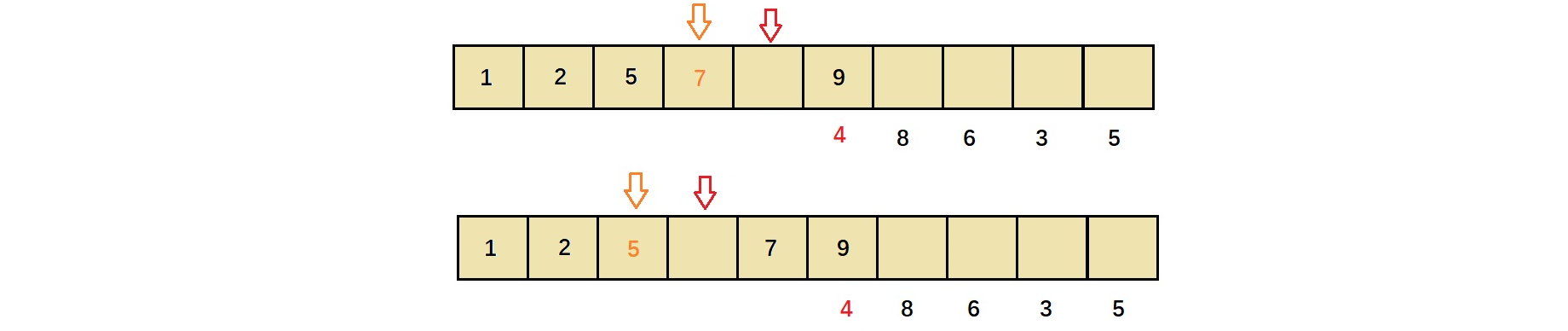 情况一:待插入元素的位置在数组中间,该情况下end经过上一轮判断自减一次,实际插入位置为end+1。