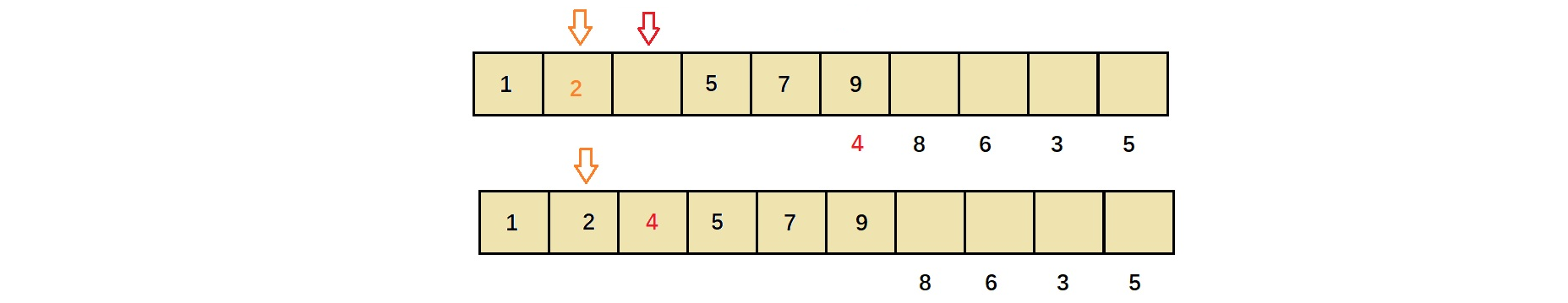 4与2比较,此时4比2大,则意味着arr[1]后位置为4的正确位置,将4放入。