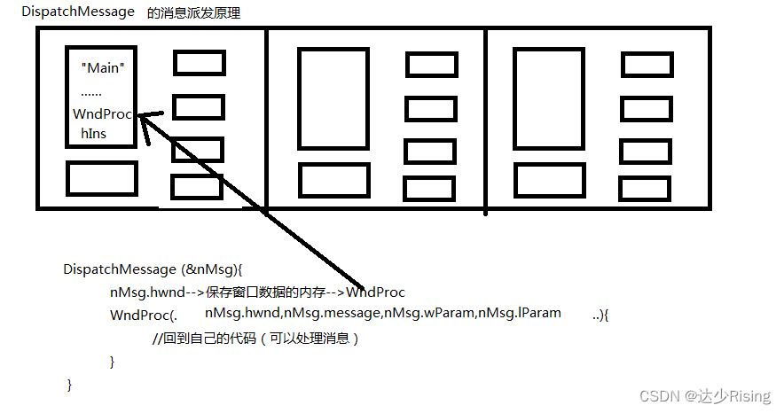 while(GetMessage(&nMsg,NULL,0,0)){TranslateMessage(&nMsg);DispatchMessage(&nMsg);//将消息交给窗口处理函数来处理}