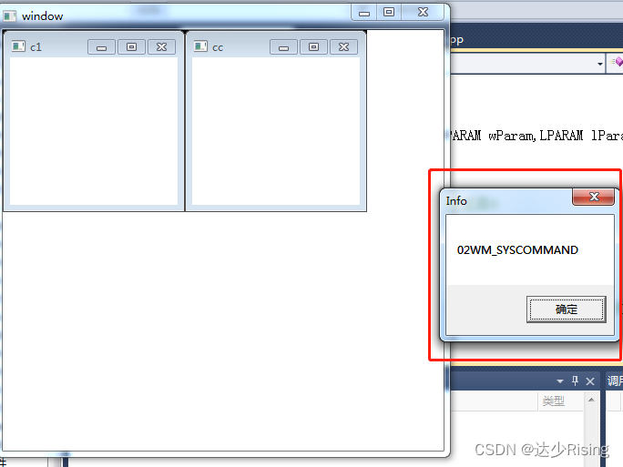 {switch(msgID){case WM_SIZE:onSize(hWnd, lParam);break;case WM_CREATE://onCreate(hWnd, lParam);break;case WM_DESTROY://PostQuitMessage(0);//可以使GetMessage函数返回0//窗口能顺利关闭,说明GetMessage能抓到PostMessage发送的消息PostMessage(hWnd, WM_QUIT, 0, 0);//PostQuitMessage内部调用此函数//窗口不能顺利关闭,说明GetMessage不能抓到SendMessage发送的消息//SendMessage(hWnd, WM_QUIT, 0, 0);break;case WM_SYSCOMMAND:if(wParam == SC_CLOSE){MessageBox(hWnd,"是否退出","Info",MB_YESNO);}else{return 0;}break;}return DefWindowProc(hWnd, msgID, wParam, lParam);//给各种消息默认处理