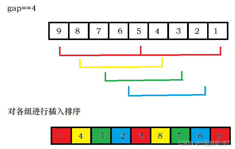 {for (int gap = numsSize / 2; gap >= 1; gap /= 2){for (int i = 0; i < numsSize - gap; i++){int end = i;int temp = nums[end + gap];while (end >= 0 && nums[end] > temp){nums[end + gap] = nums[end];end -= gap;}nums[end + gap] = temp;}}