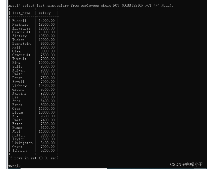 select last_name,salary from employees where NOT (COMMISSION_PCT <=> NULL);