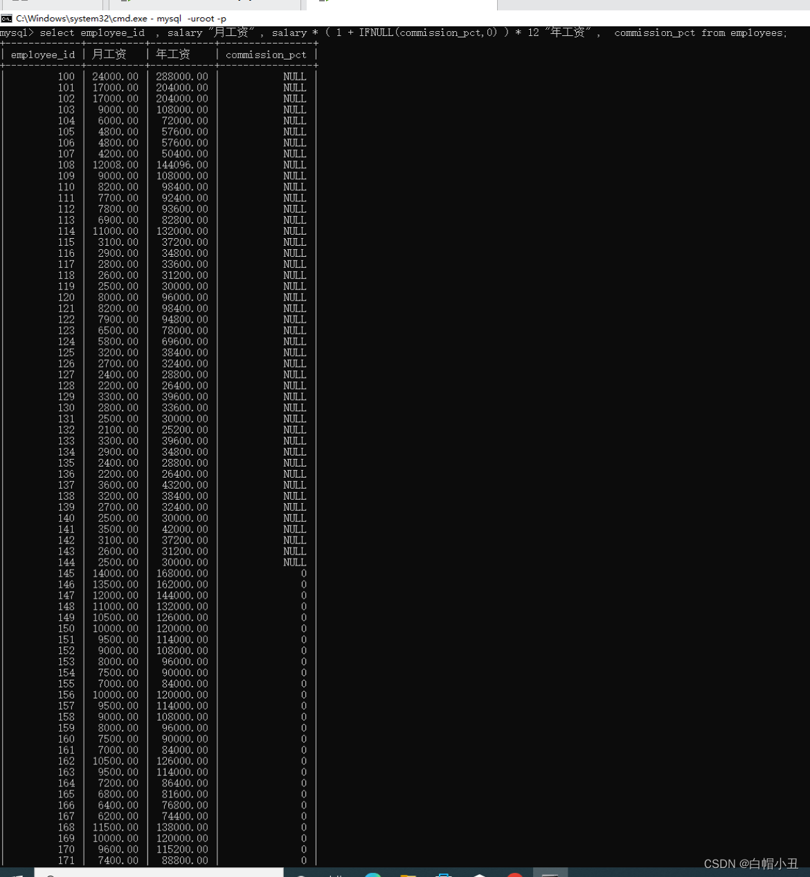 select employee_id , salary “月工资” , salary * ( 1 + IFNULL(commission_pct,0) ) * 12 “年工资” , commission_pct from employees;