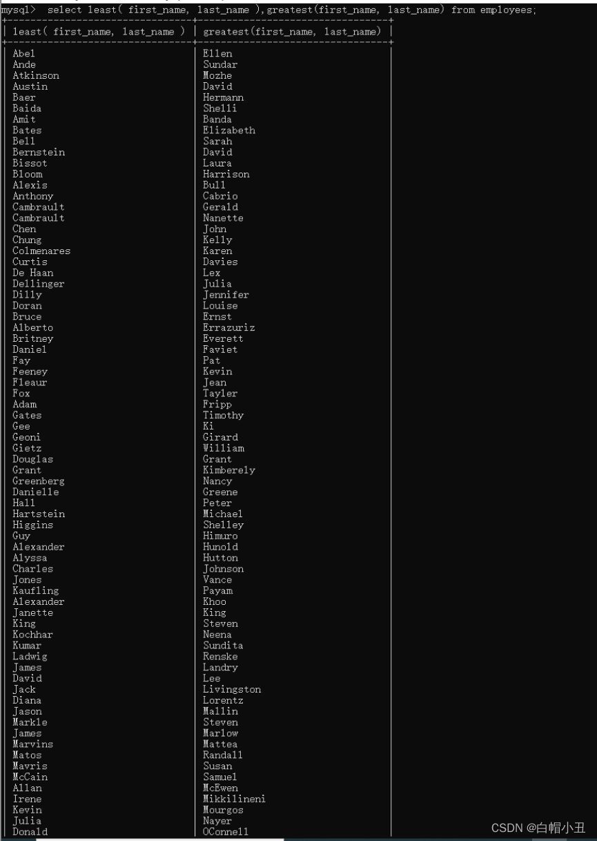 select least( first_name, last_name ),greatest(first_name, last_name) from employees;