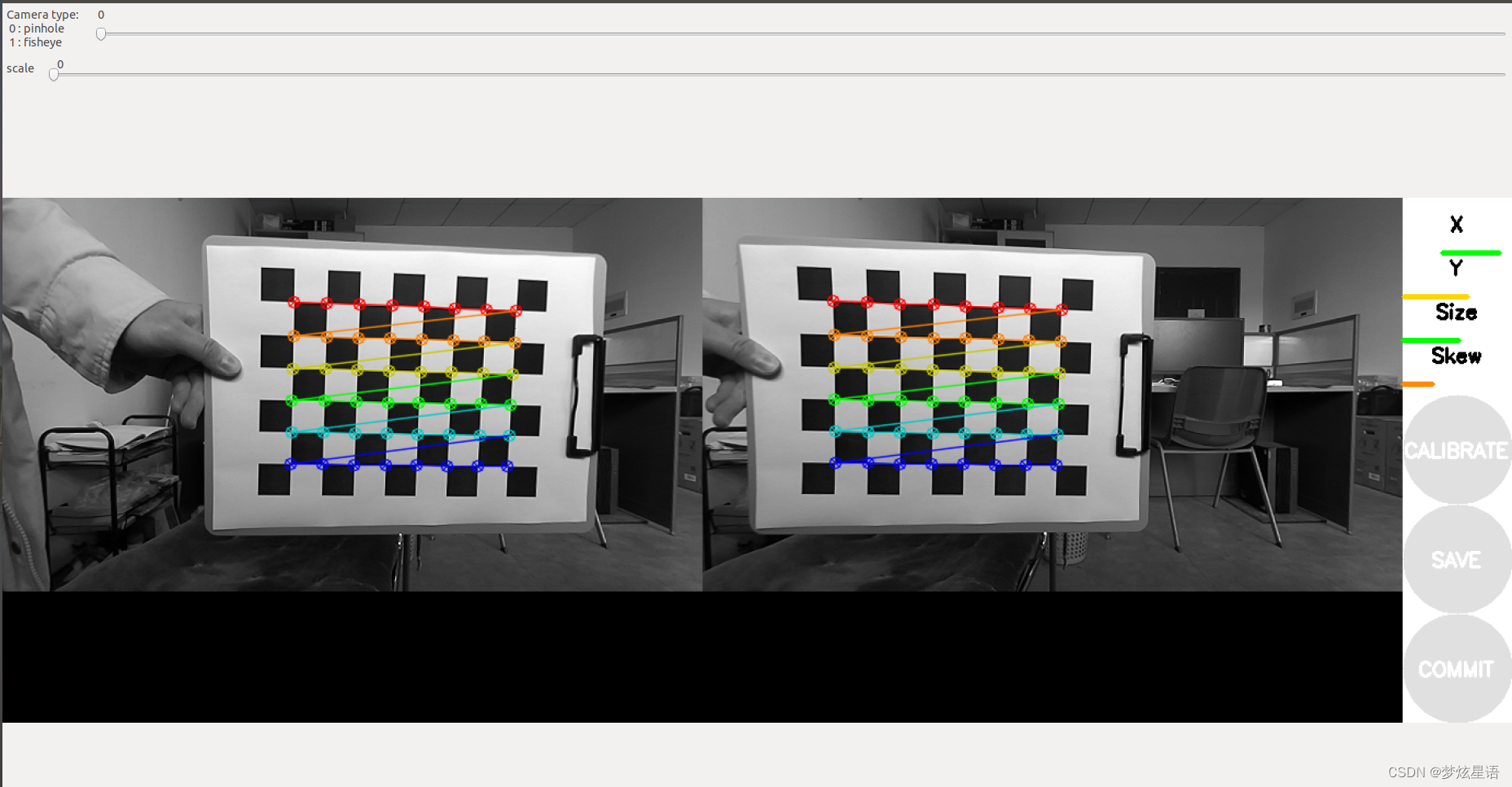 我们的工作就是从左到右、从上到下,从远到近,并且不断变换标定板的角度,使四个标志条都变为绿色。