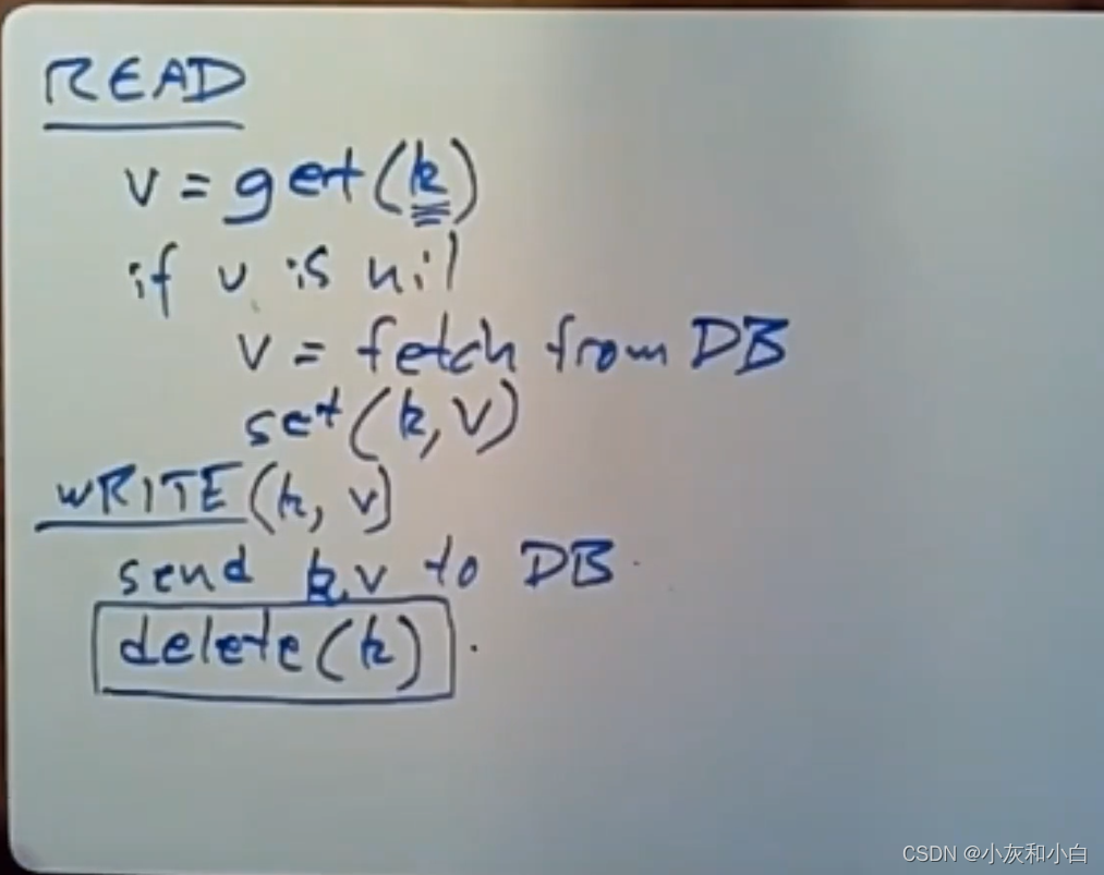 假设有个Client1想去读取某个key所对应的数据,但memcache表示它里面并没有这些数据。C1就会从数据库中读取数据,假设它取回的值是v1。与此同时,C2想对该数据进行更新,C2会将要修改的数据(V2)传入这个write操作,并发送给数据库。C2要做的另一件事情就是将原来的数据从memcache中删除,数据库也会将key所对应的数据从memcache中删除,paper中说过delete操作是幂等的,所以delete始终是安全的。
