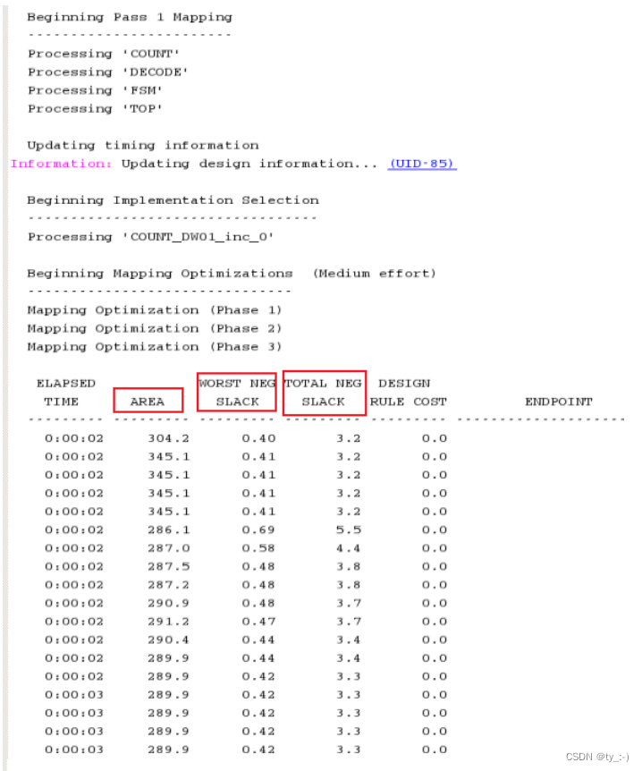 其中area表示面积,Worst neg slack表示相对于其约束,设计中的关键路径或最坏路径有多少是违反的(实际的delay减去预期的delay)。total neg slack表示violating path slacks的总数。