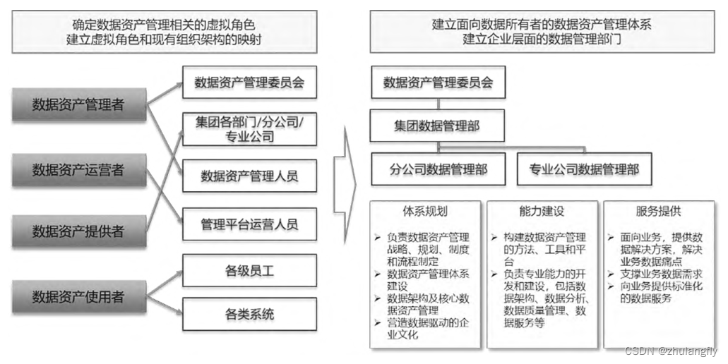 - 组织保障:首先确定数据资产管理相关的虚拟角色,建立虚拟角色和现有组织架构的映射关系;然后成立企业层面的数据管理部门,逐步建立面向数据所有者的数据资产管理体系,如下图所示: