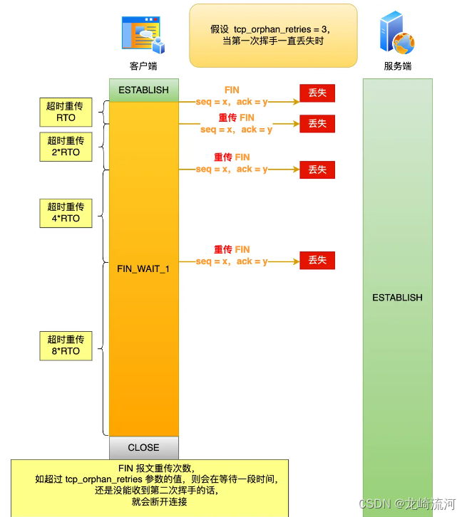 为防止这种情况,客户端等足够长时间确保服务端能够收到ACK,如果服务端没有收到ACK就会触发TCP重传机制,服务端会重新发生一个FIN,这样一去一来刚好两个MSL时间。