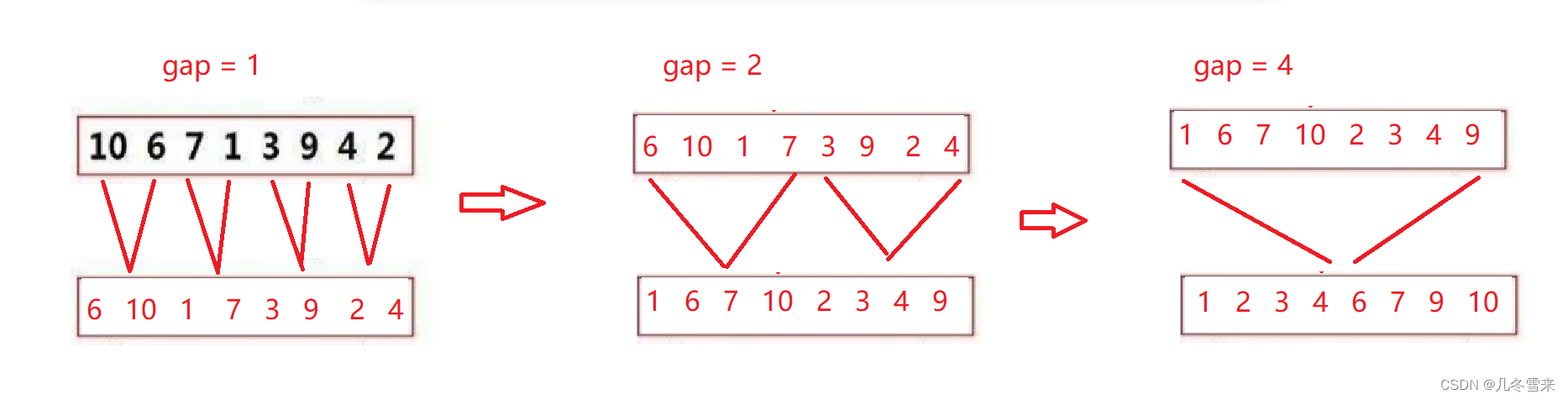 在这里我们取一个gap值,每次归并后我们的gap值增加,我们每次参与归并的元素个数也随之增加。 就类似我们上图这样,不过这种方法有需要修改的点,比如边界问题等,我们就留到下一篇博客来讲解了。
