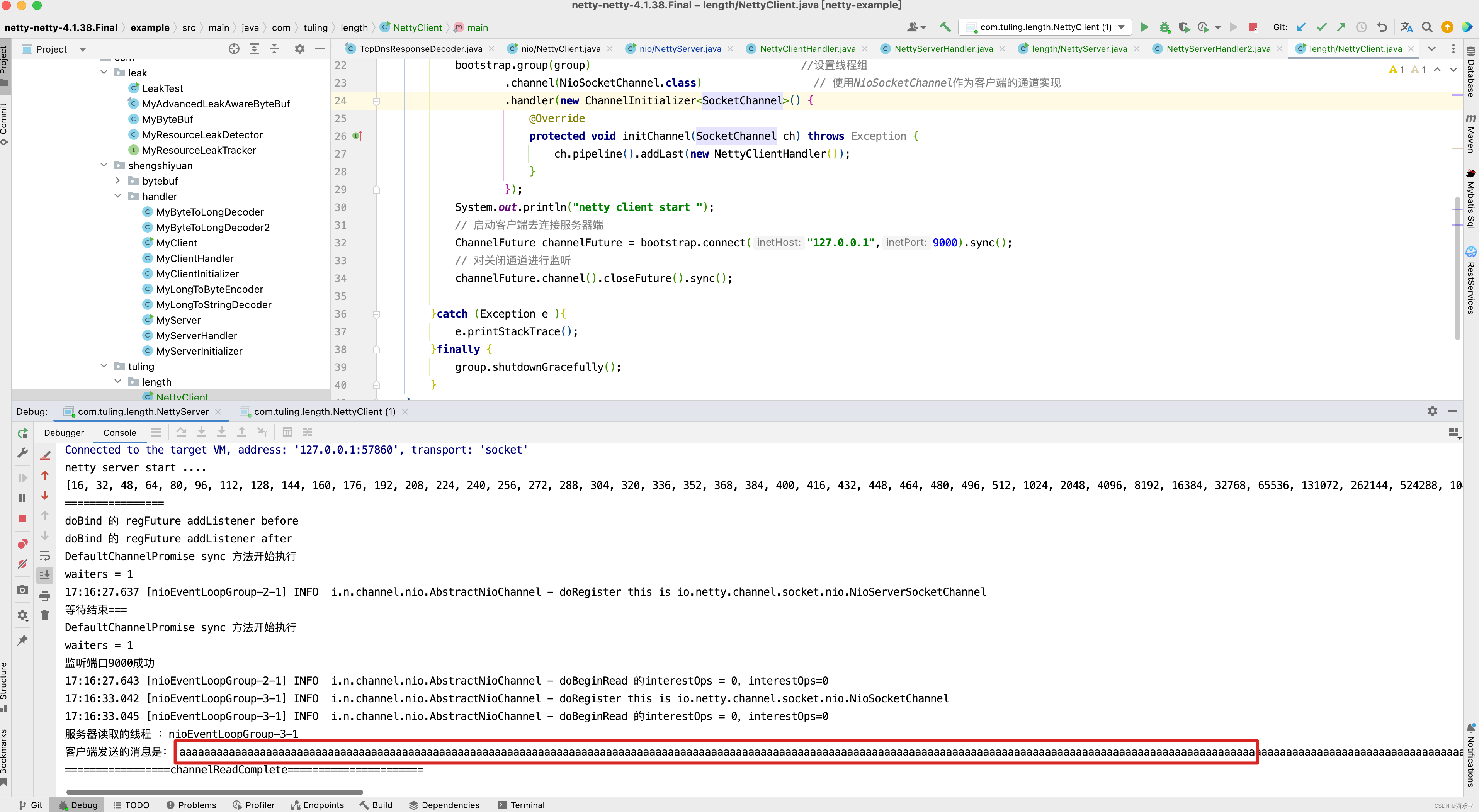}public class NettyClientHandler extends ChannelInboundHandlerAdapter {// 当客户端连接服务器完成就会触发这个方法@Overridepublic void channelActive(ChannelHandlerContext ctx) throws Exception {StringBuffer sb = new StringBuffer();for(int i = 0 ;i < 1023;i ++){sb.append("a");}sb.append("中");sb.append("bbbb");ByteBuf buf = Unpooled.copiedBuffer(sb.toString(), CharsetUtil.UTF_8);ctx.writeAndFlush(buf);}// 当通道在读取事件时会触发,即服务端发送数据给客户端@Overridepublic void channelRead(ChannelHandlerContext ctx, Object msg) throws Exception {ByteBuf buf = (ByteBuf) msg;System.out.println(" 收到服务端的消息: " + buf.toString(CharsetUtil.UTF_8));System.out.println("服务端的地址:" + ctx.channel().remoteAddress());}@Overridepublic void exceptionCaught(ChannelHandlerContext ctx, Throwable cause) throws Exception {cause.printStackTrace();ctx.close();}