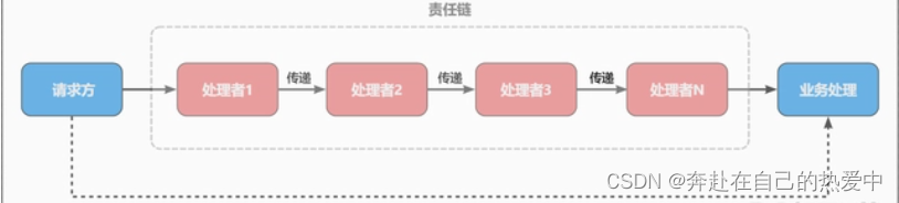 责任链模式属于行为型模式,是为请求创建了一个接收者对象的链,将链中每一个节点看作是一个对象,每个节点处理的请求均不同,且内部自动维护一个下一节点对象。