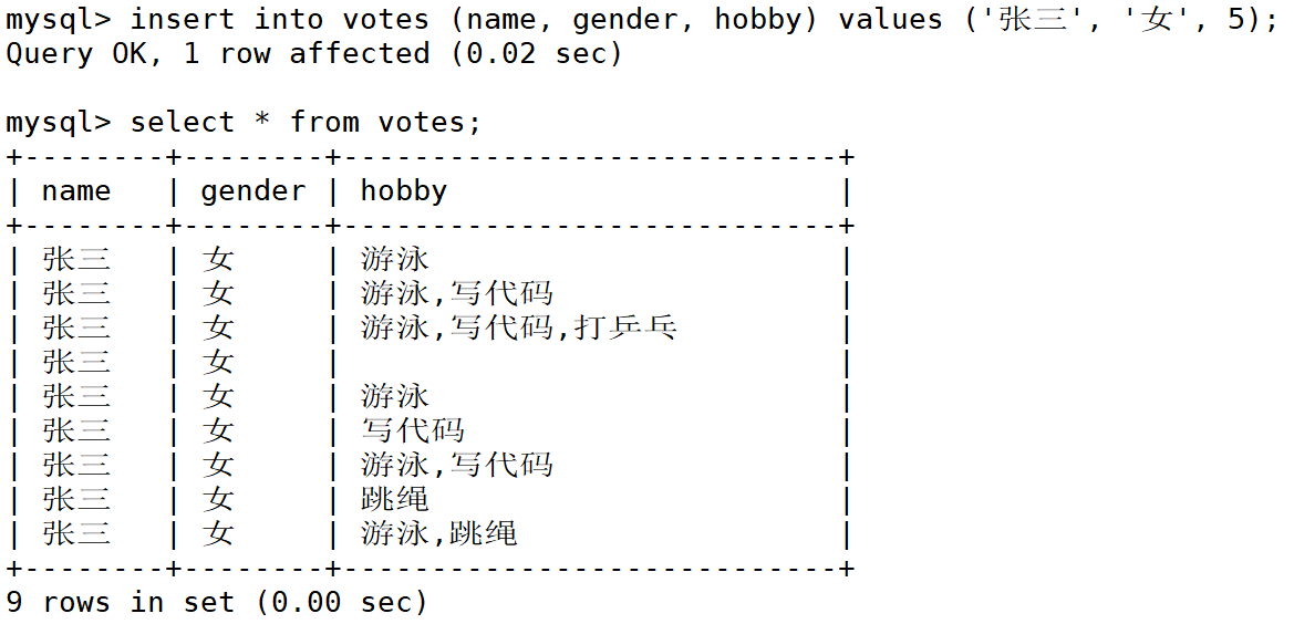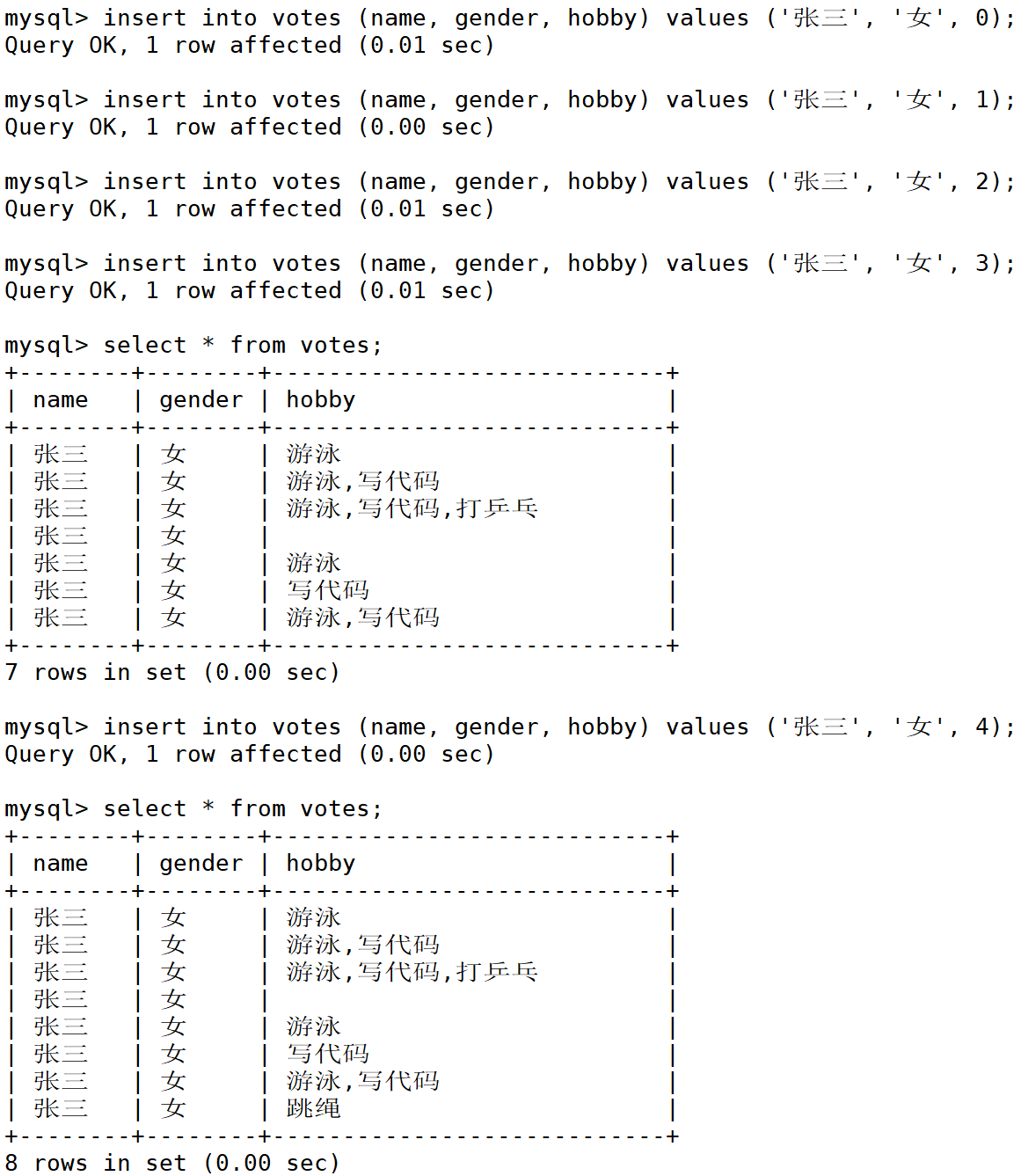 ② 最终一个单元格中,实际存储了其中任意多个值,而且出于效率考虑,实际存储的是数字(这些选项的每个选项值依次对应数字 1, 2, 4, …,最多 64 个)。因此,当我们插入集合值时,除了可以通过选项值来设置之外,还可以通过数字来设置。