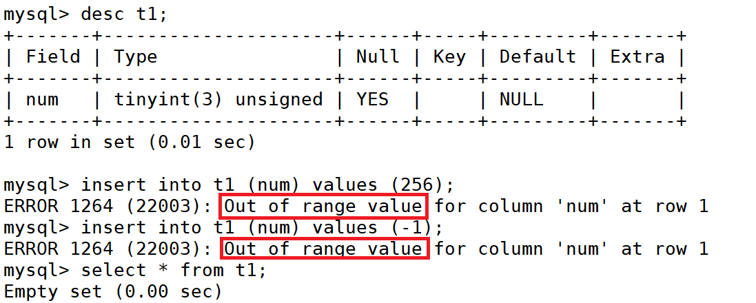 tinyint [unsigned]:带符号范围[-128, 127],无符号范围[0, 255]。默认有符号