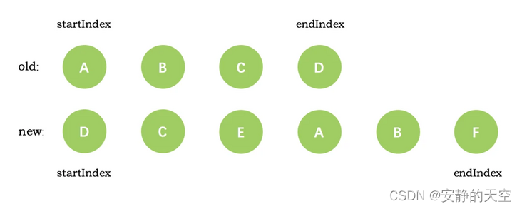 ② 情况:当新老 VNode 节点的 end 满足 sameVnode 时,同样直接 patchVnode 即可,同时新老 VNode 节点的结束索引都减 1if (sameVnode(oldStartVnode, newStartVnode)) {patchVnode(oldStartVnode, newStartVnode, insertedVnodeQueue, newCh, newStartIdx)oldStartVnode = oldCh[++oldStartIdx]newStartVnode = newCh[++newStartIdx] }