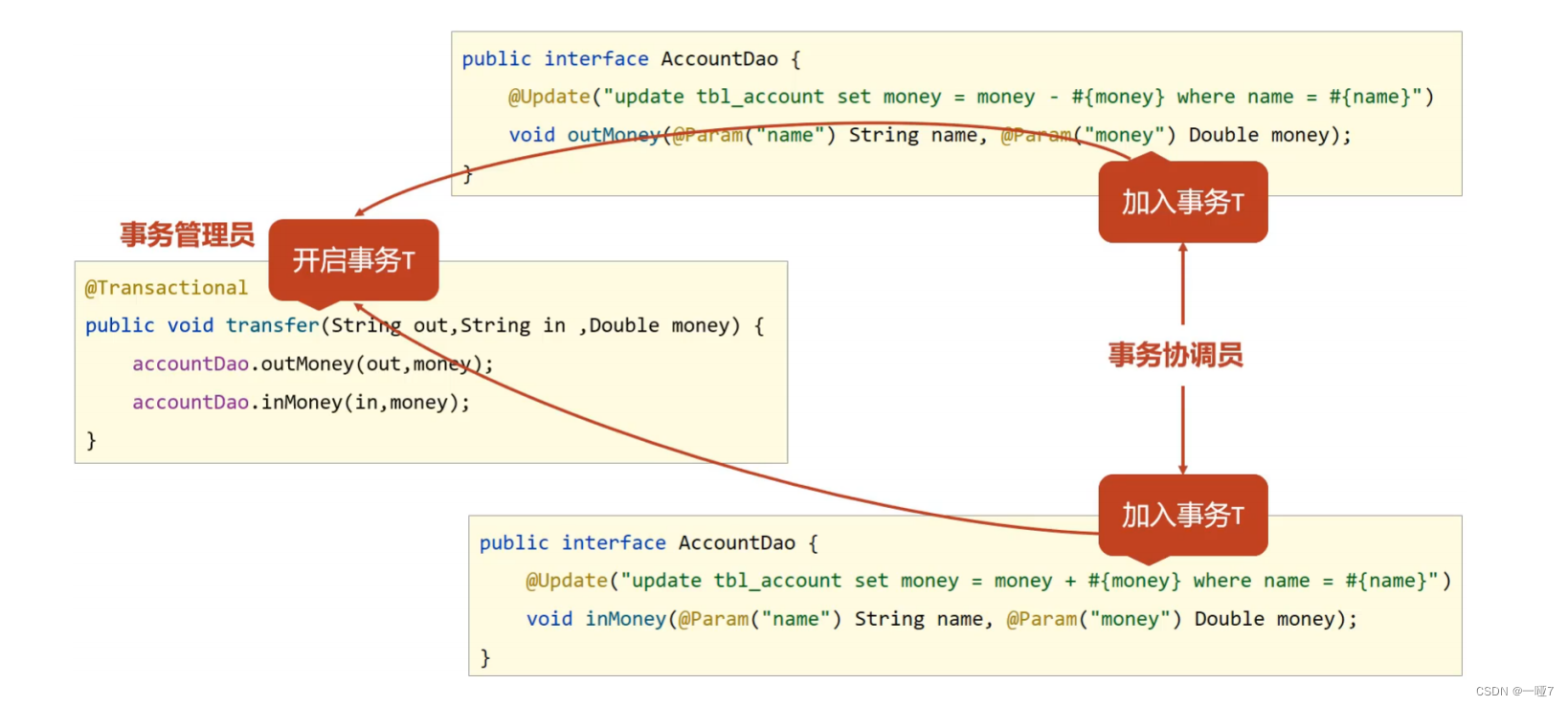 - 事务协调员:加入事务方,在Spring中通常指代数据层方法,也可以是业务层方法