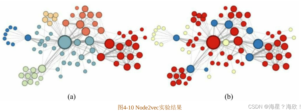 Node2vec 这种灵活表达同质性和结构性的特点也得到了实验的证实,通过调整参数p和q产生了不同的Embedding结果。图4-10(a)就是Node2vec更注重同质性的体现,可以到距离相近的节点颜色更为接近,图 4-10(b)则更注重体现结构性,其中结构特点相近的节点的颜色更为接近。
