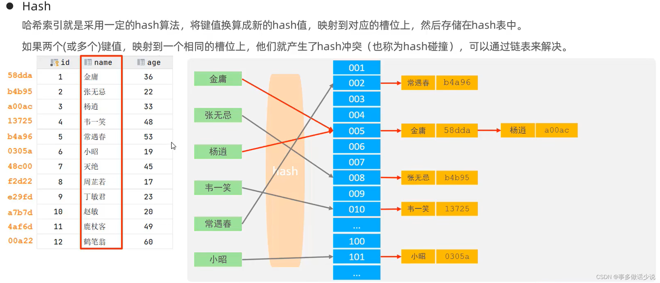 | Hash索引 | 底层数据结构用哈希表实现,不支持范围查询 |