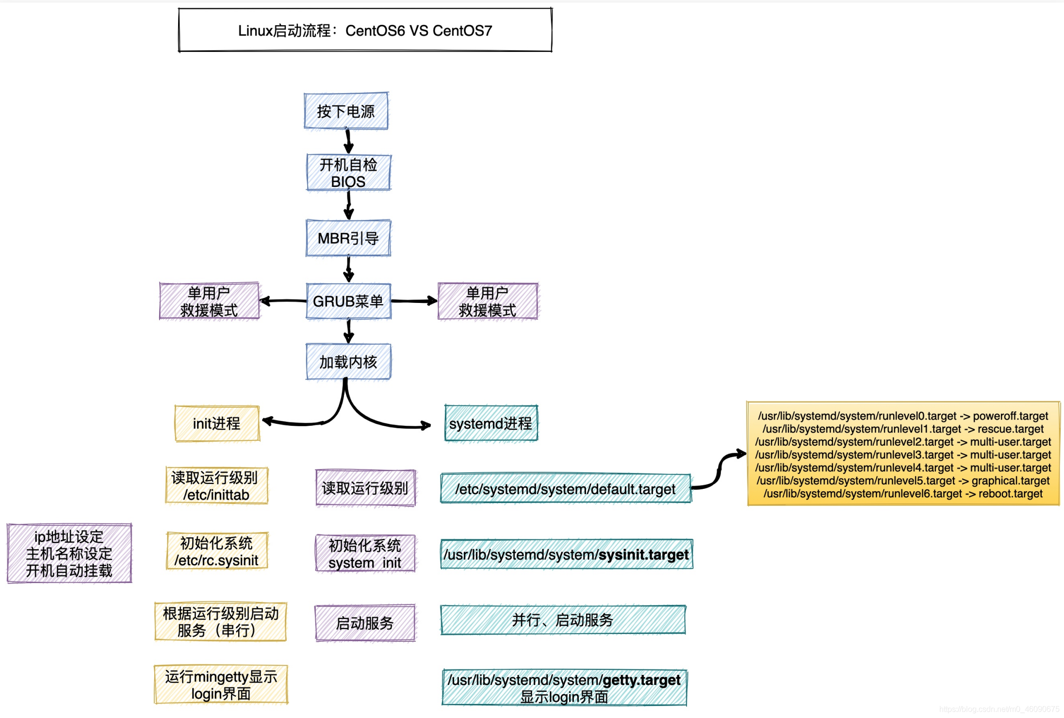 一、系统启动流程 1.centos6 centos6开机启动流程,传送门 2.centos7启动流程 二、系统启动运行级别 2.1 什么是运行级别 运行级别:指操作系统当前正在运行的功能级别; [rootweb01 ~]# ll /usr/lib/systemd/system lrwxrwxrwx. 1 root root…...
