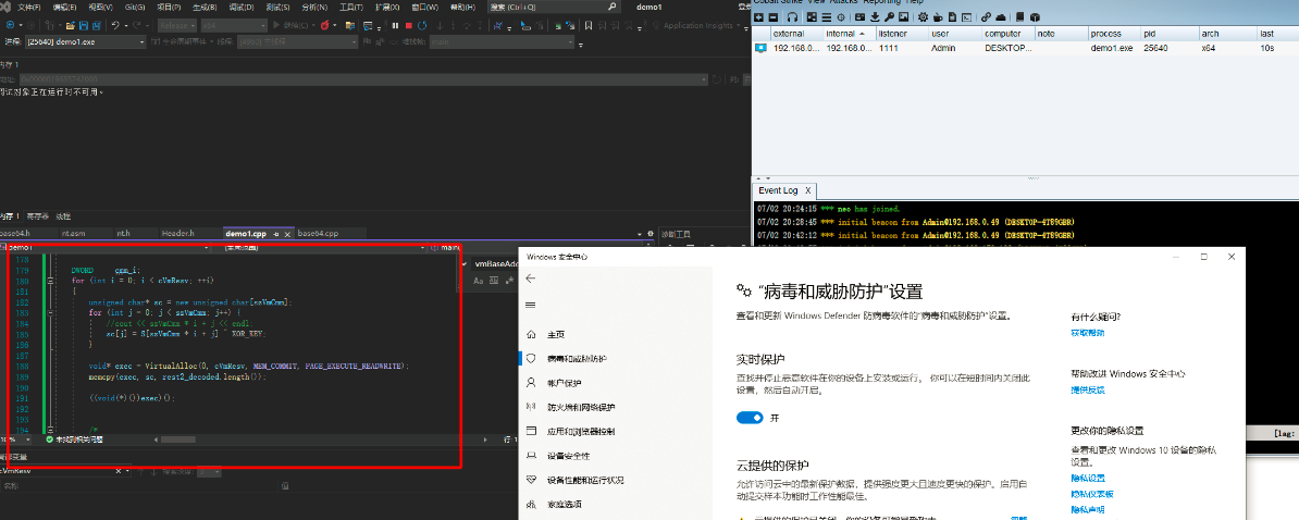 下面根据《三》中的“beacon 的内存加密”对 demo3 进行优化,使用 RefleXXion 工具的第二种将内存设为 NO_ACCESS 并通过注册异常处理还原的方式进行免杀。
