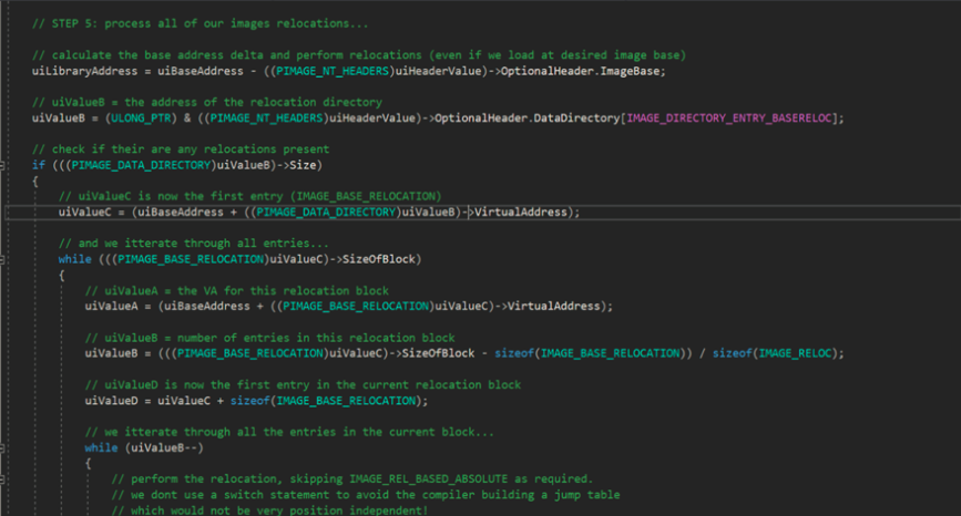 reflective loader 实际上是一个自己实现的 LoadLibraryW 函数,从内存中找到我们写入的 dll 并修复使其成为可以被正常使用的 pe 文件,最后调用 DLLmain 实现我们的恶意功能。