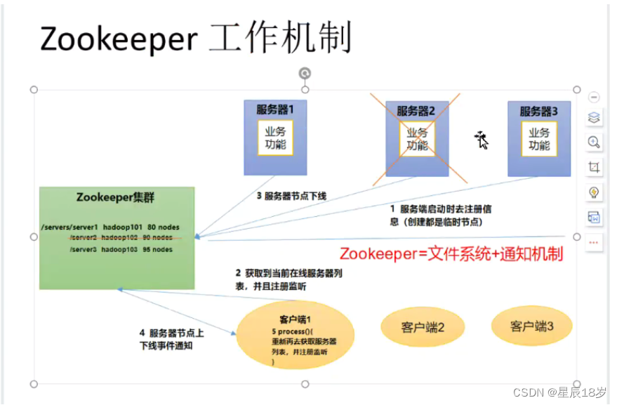 (2)ZooKeeper可以实现实时监控节点状态变化。可将节点信息写入ZooKeeper上的一个ZNode。监听这个ZNode可获取它的实时状态变化。