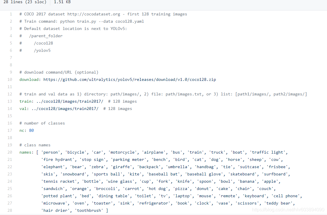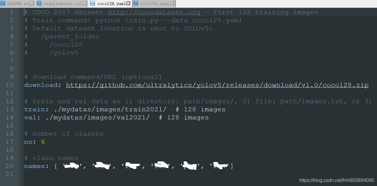 我们需要修改的是 train: 和 val: 和 nc: 和 names: [ 'a', 'b', 'c'] 四行,分别对应训练图片的路径,验证图片的路径,以及数据集的类别的数量,和那些类别的名字。改完的效果例子(sm隐藏):