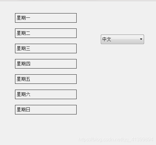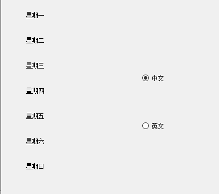 {static int lastindex = 0;if(index == lastindex)return;lastindex = index;QList<QLabel *> lbs = this->findChildren<QLabel *>();int i_cnt = 0;foreach (QLabel *lb, lbs) {lb->setText(tr("%1").arg(weekStr[index][i_cnt++]));}for(int i = 0;i<2;i++){ui->comboBox->setItemText(i,language[index][i]);}