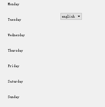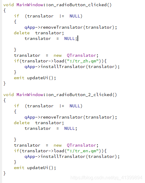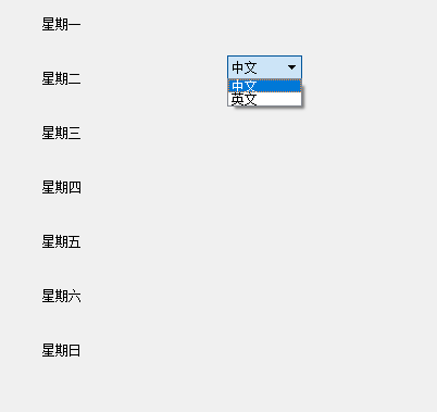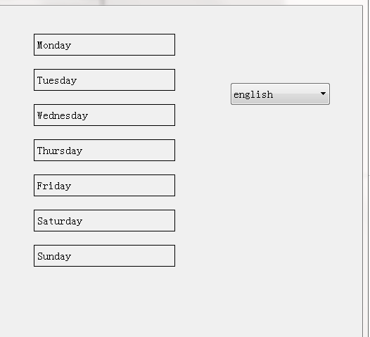 {static int lastIndex = 0;if(index == lastIndex)return;lastIndex = index;static  QTranslator*  translator;if  (translator  !=  NULL){qApp->removeTranslator(translator);delete  translator;translator  =  NULL;}translator  =  new  QTranslator;if(index==0){if(translator->load(":/tr_zh.qm")){qApp->installTranslator(translator);}}else{if(translator->load(":/tr_en.qm")){qApp->installTranslator(translator);}}ui->label->setText(tr("星期一"));ui->label_2->setText(tr("星期二"));ui->label_3->setText(tr("星期三"));ui->label_4->setText(tr("星期四"));ui->label_5->setText(tr("星期五"));ui->label_6->setText(tr("星期六"));ui->label_7->setText(tr("星期日"));ui->comboBox->setItemText(0,tr("中文"));ui->comboBox->setItemText(1,tr("英文"));